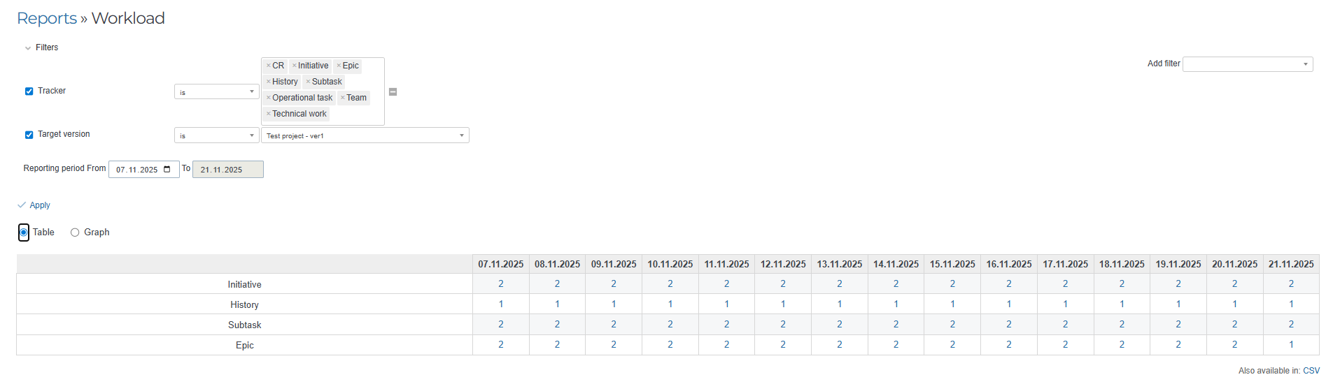 The "Sprint Load" report shows the dynamics of version and issue tracker changes in the current sprint as a table: