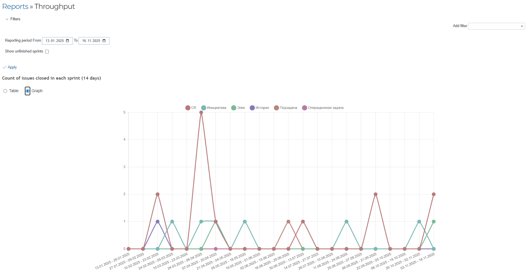 The throughput chart shows the number of issues completed by the team over a specified period (usually during a sprint).
