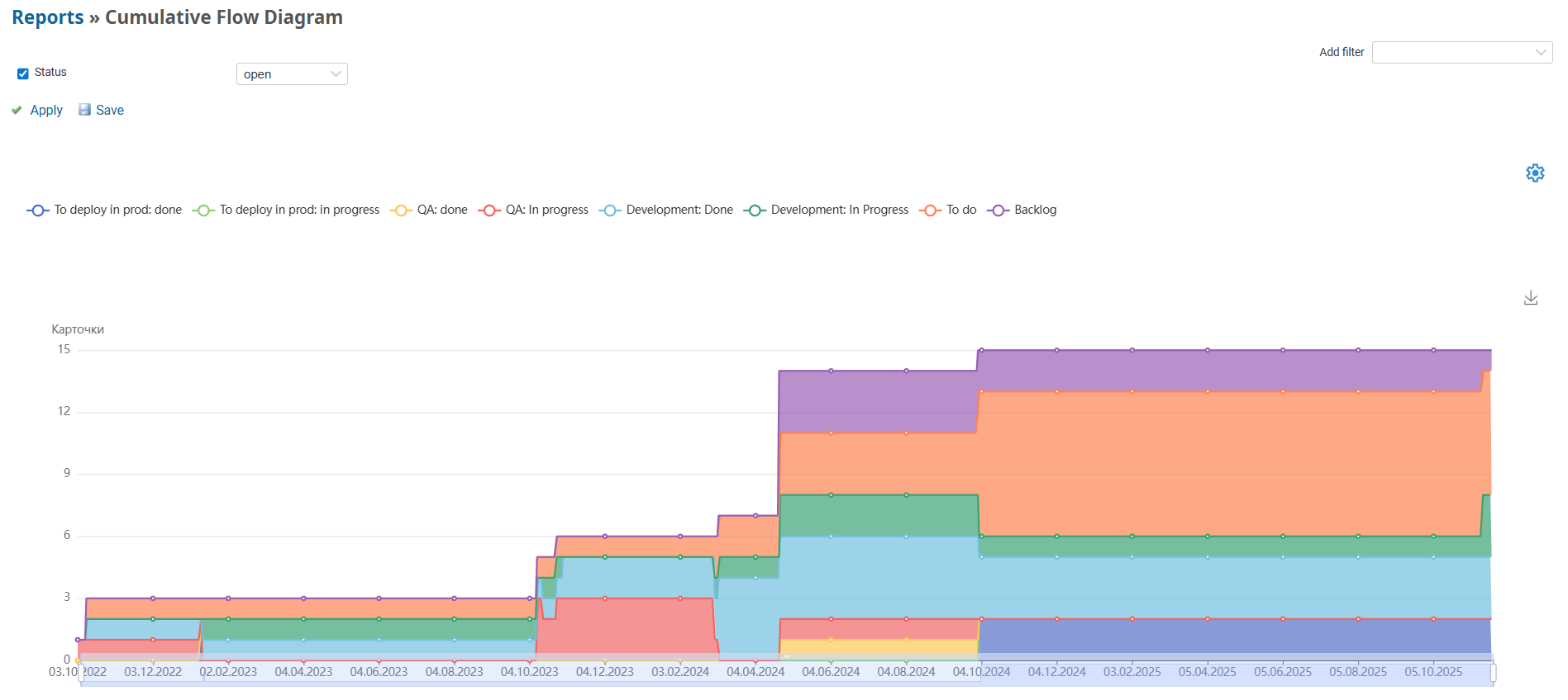 The diagram shows how issues accumulate and move between statuses, allowing you to analyze the balance between incoming issues and completed issues.