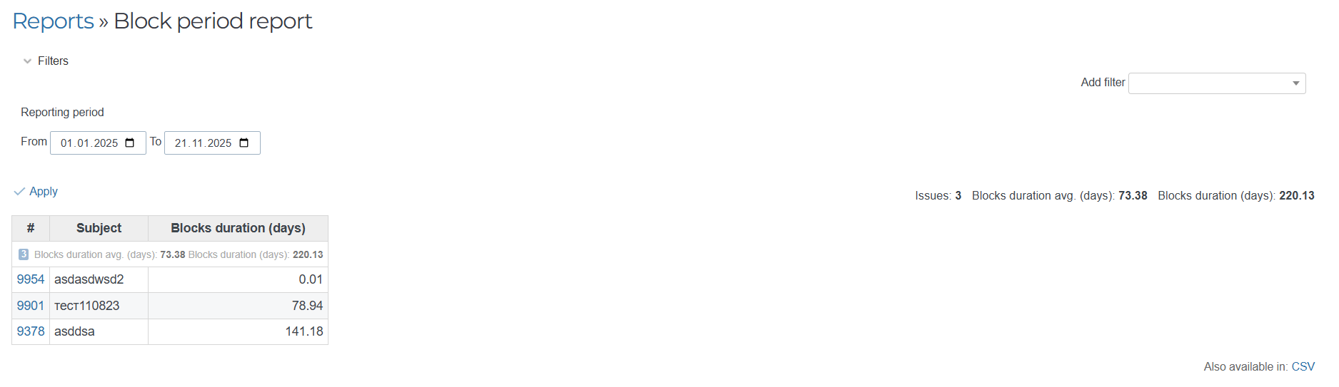 The report provides a historical analysis of blocks over a selected time period, showing the dynamics of issue block and resolution.