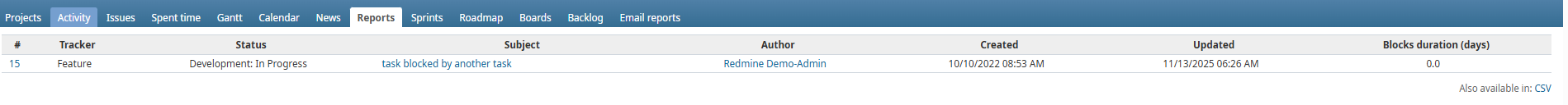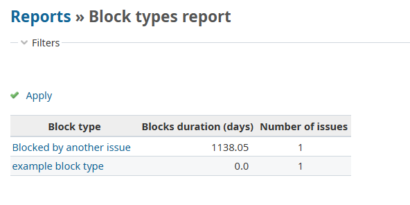 The Blocks report provides detailed analytics on issue downtime, focusing on block duration - a key metric for assessing the impact of downtimes on the project's progress.